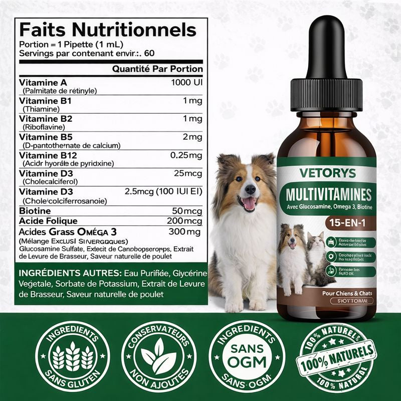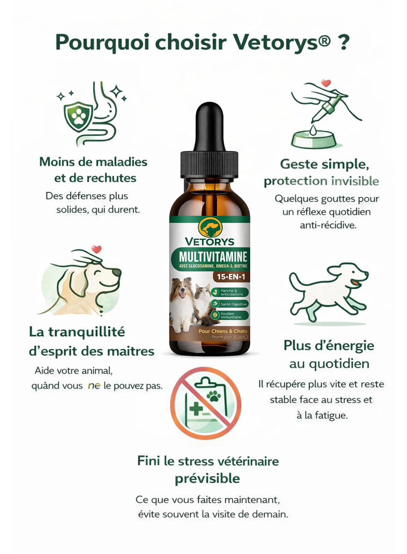 La formule de Vetorys® Immunité s’appuie sur des vitamines et nutriments sélectionnés pour accompagner les défenses naturelles, sans médicament ni substance connue pour créer une accoutumance.